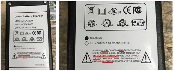 一款標(biāo)簽錯(cuò)誤百出的平衡車(chē)充電器: