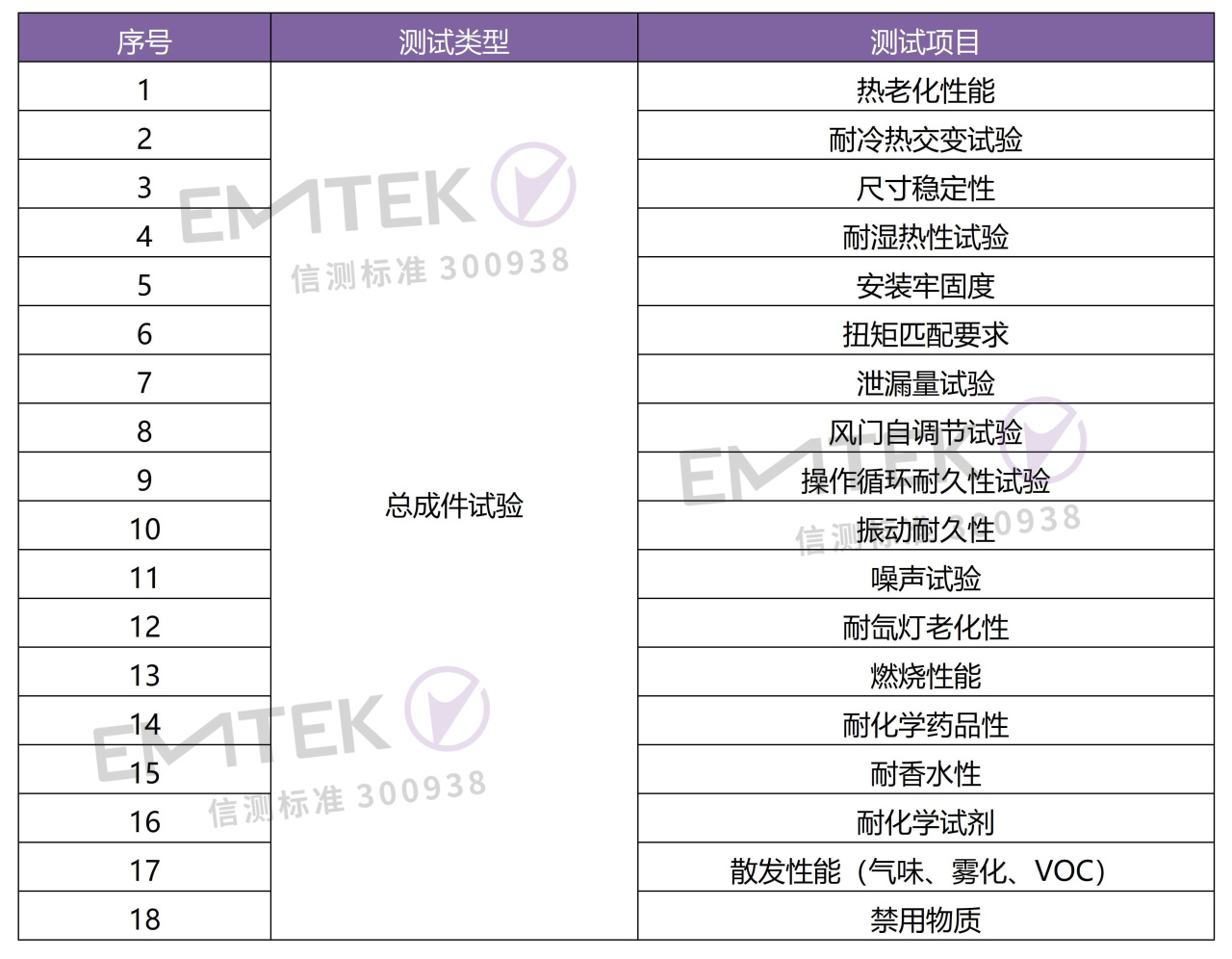 考核出風(fēng)口/風(fēng)管材料化學(xué)性能,比如燃燒性能、耐磨性、霧化、氣味、禁用物質(zhì)等。