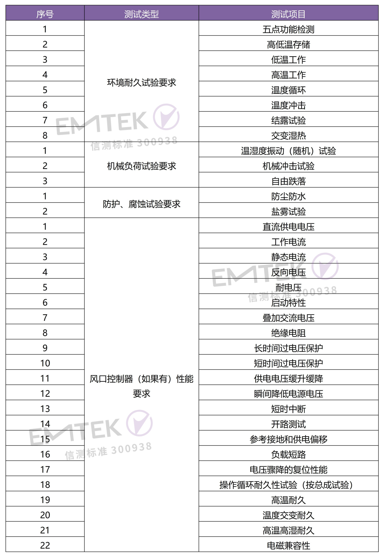 考核電動出風(fēng)口控制器性能、總成試驗(yàn)性能、防塵防水、EMC等;
