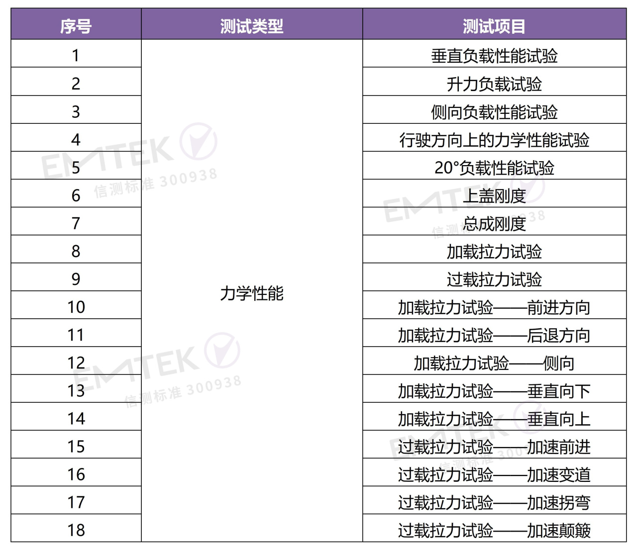 垂直負(fù)載性能試驗(yàn),升力負(fù)載試驗(yàn),側(cè)向負(fù)載性能試驗(yàn),行駛方向上的力學(xué)性能試驗(yàn),20°負(fù)載性能試驗(yàn)等;