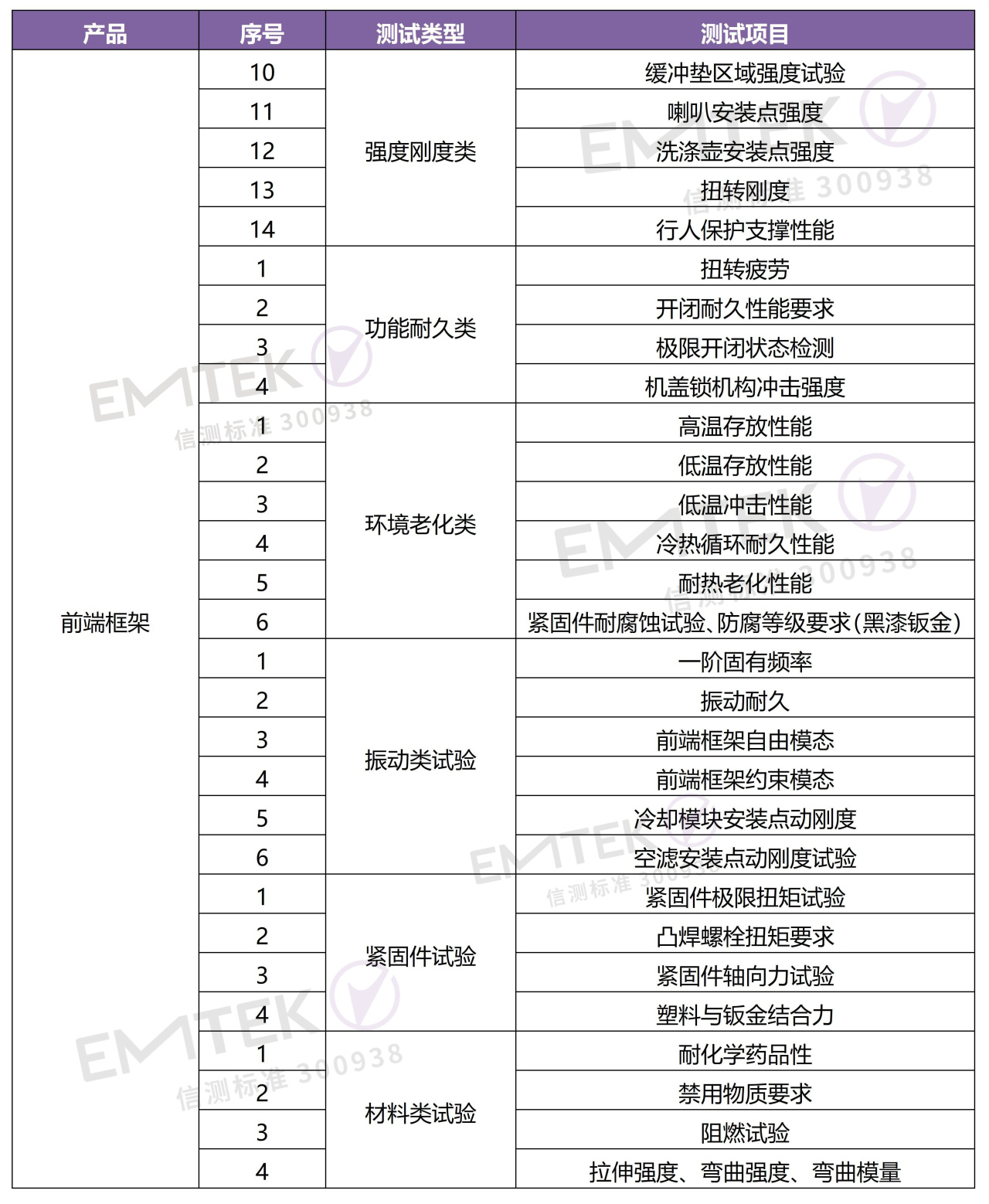 BAS810-2016、CTS-01.12.01.14.02-A2-2015 、PF.90159、QJ/GAC 1240.050-2015、DMOV CAR 00 0356、QLQB S-5050-2019、VE-ST-405、Q/DFXK 476-2018、QJXP 05JT.070-2019、GWT A F12-01:2022-03、Q/BAIC C215367-2022、Q/LiA9500002-2023等、各主機(jī)廠測試要求