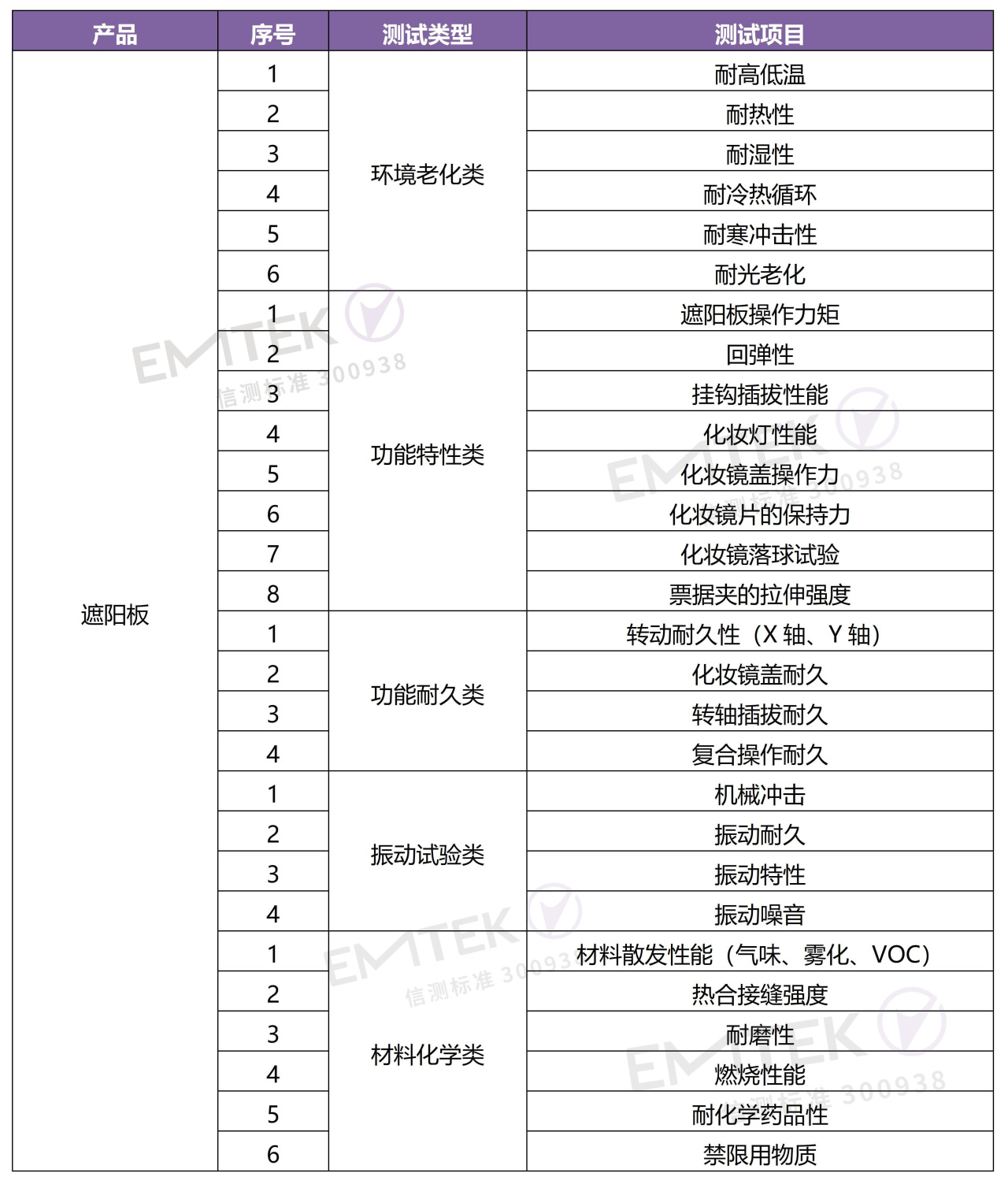 考核產(chǎn)品使用過程中承受的強度和剛性、操作功能特性及耐久、振動試驗,比如遮陽板操作性能、遮陽板翻轉(zhuǎn)耐久、振動耐久、振動噪音等;