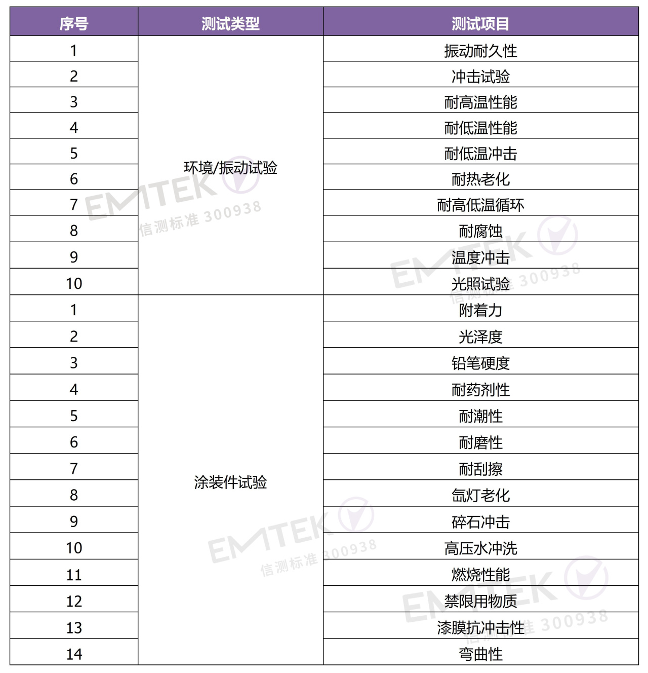 考核油漆件及其他材料性能,比如漆膜厚度、附著力、耐水、耐化學(xué)試劑、抗石擊、高壓沖洗、漆膜抗沖擊性、彎曲性等。