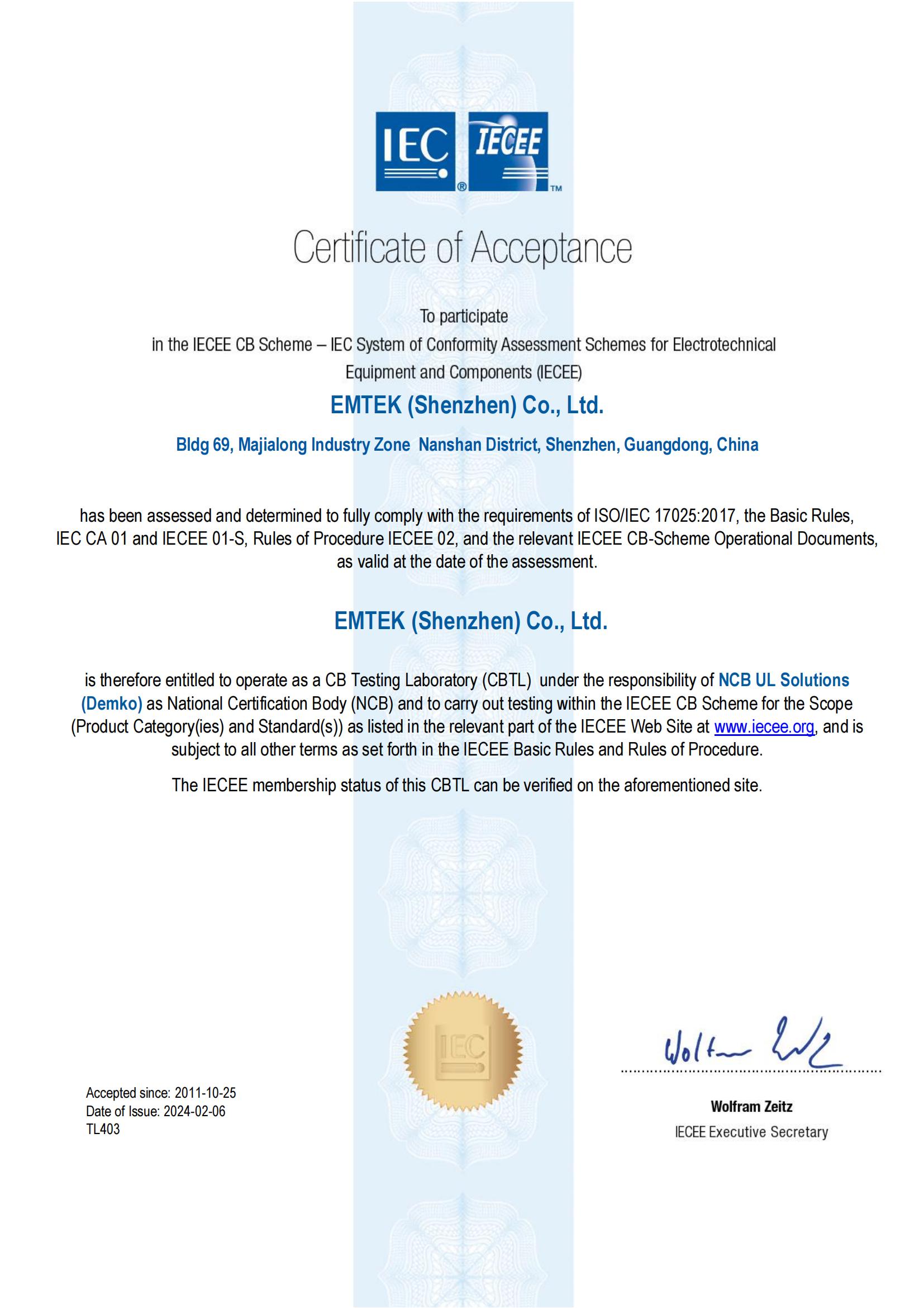 IECEE的認證授權(quán)資質(zhì)證書