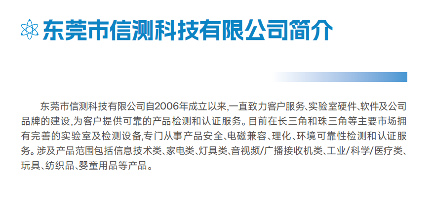 實(shí)驗(yàn)室總面積8000平方米,擁有可靠性檢測中心、玩具檢測中心,燈具檢測中心,電池檢測中心,鞋材與紡織品檢測中心,汽車電子檢測中心,音視頻產(chǎn)品檢測中心,信息技術(shù)設(shè)備檢測中心,電源檢測中心,EMC/RF檢測中心共10個(gè)專業(yè)檢測中心,檢測基地已有專業(yè)成套檢驗(yàn)檢測設(shè)備1200套,獲得了CNAS,CMA,A2LA,F(xiàn)CC等權(quán)威機(jī)構(gòu)的認(rèn)可,能夠?yàn)殡娮与姎猱a(chǎn)品,日用消費(fèi)品,汽車電子產(chǎn)品提供一站式的產(chǎn)品全生命周期的測試認(rèn)證服務(wù)解決方案。