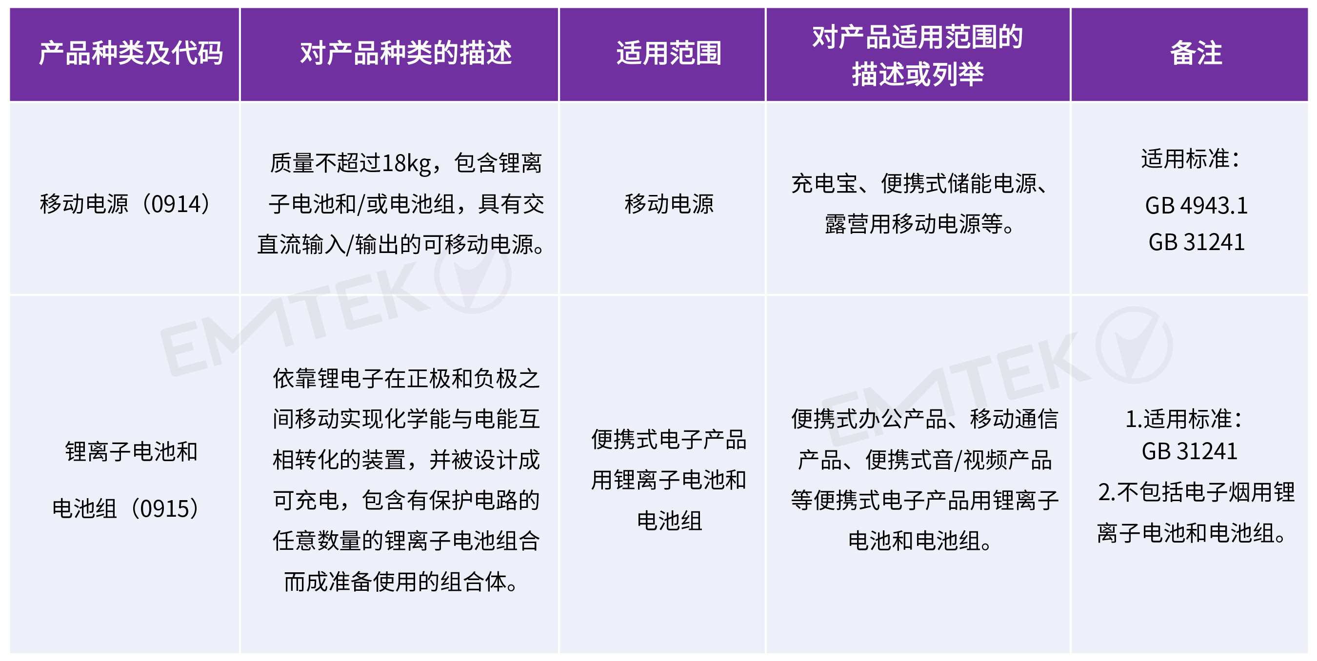 2022年9月17日,國務(wù)院辦公廳(國辦發(fā)〔2022〕31號)文件中明確電子電器產(chǎn)品使用的移動電源、鋰離子電池和電池組納入到強制性產(chǎn)品認(rèn)證目錄。2023年3月16日,認(rèn)監(jiān)委10號公告公布了移動電源、鋰離子電池和電池組的認(rèn)證界定范圍,并公布自2023年8月1日起,指定認(rèn)證機構(gòu)開始受理新納入產(chǎn)品CCC認(rèn)證委托。2024年8月1日強制實施。