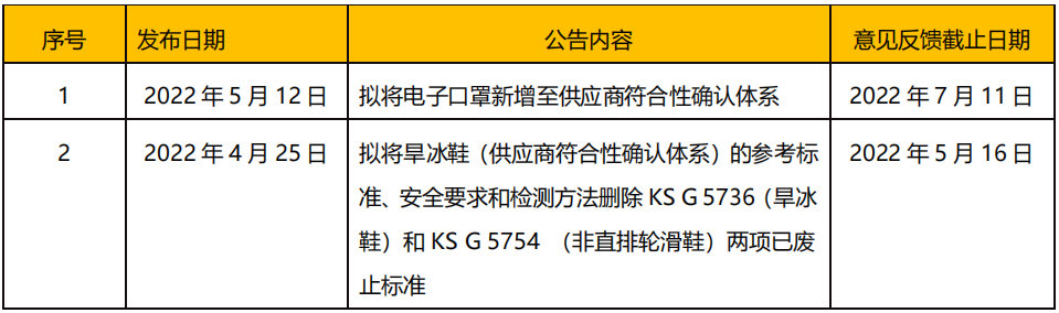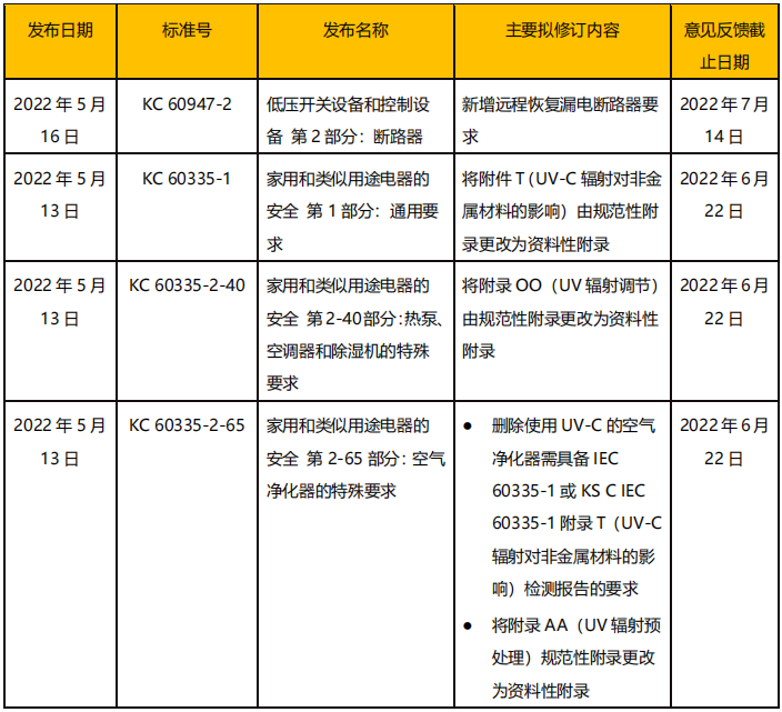 2022 年 6 月消息,韓國技術(shù)標(biāo)準(zhǔn)院(KATS)發(fā)布數(shù)項公告,就多個電氣安全標(biāo)準(zhǔn)和家用產(chǎn)品安全標(biāo)準(zhǔn)的修訂公開征求意見,相關(guān)內(nèi)容見下表。