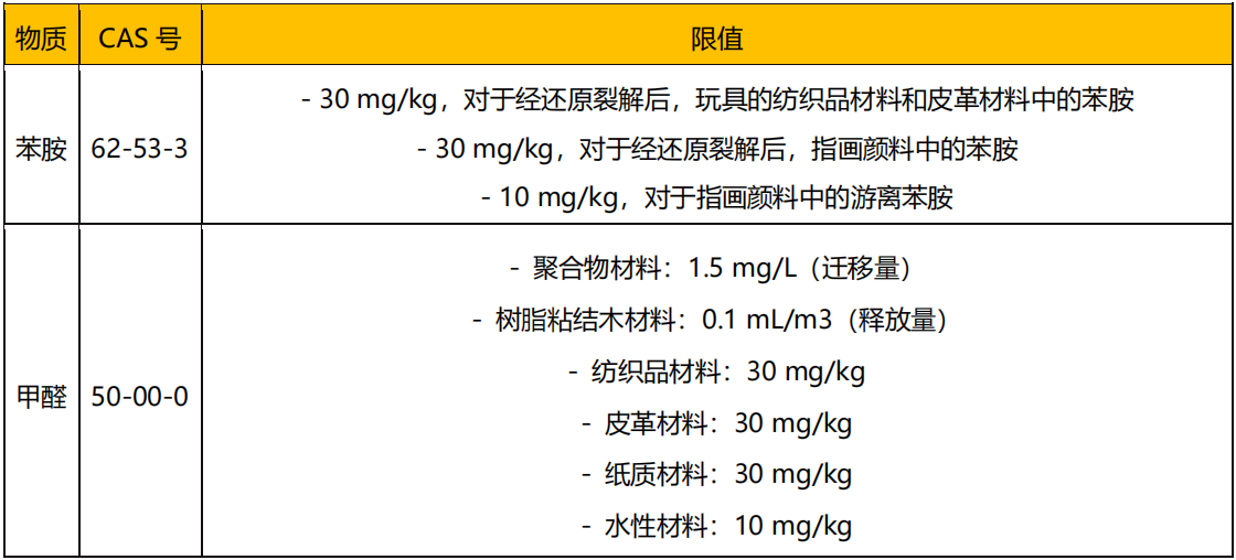 (1)將苯胺限值和甲醛限值增添至英國《玩具(安全)法規(guī) 2011》(S.I. 2011 No. 1881)附表 2 附錄 C,其規(guī)定了 36 個月以下兒童使用的玩具或其他意圖放入口中的玩具中有害化學(xué)物質(zhì)的要求:
