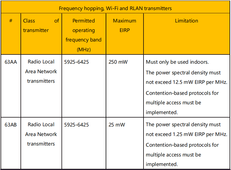 目前的文件增加了一個新的頻段:5925-6425MHz,用于無線電局域網(wǎng)發(fā)射器的低功率水平下的運行,并糾正了以前在載波頻率方面的錯誤。