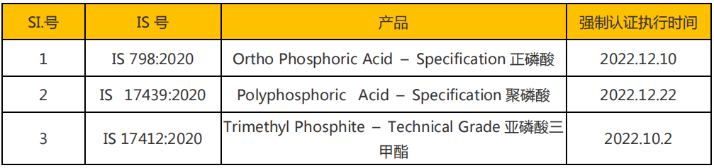 凡列入強(qiáng)制認(rèn)證的產(chǎn)品,都需按印度標(biāo)準(zhǔn)獲得產(chǎn)品認(rèn)證證書后才能進(jìn)入印度市場。以下列出了最新的印度BIS 強(qiáng)制認(rèn)證化學(xué)品清單及它們的執(zhí)行時(shí)間。