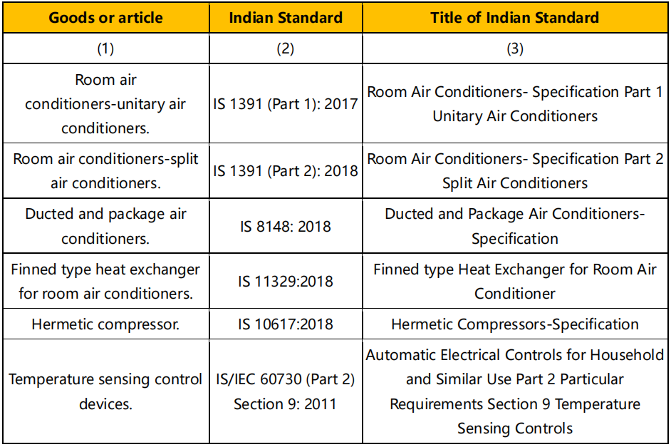 2022 年 12 月 21 日,印度 BIS 發(fā)布公告,空調(diào)及相關(guān)設(shè)備零件,密封壓縮機(jī)和溫度傳感控制器產(chǎn)品強(qiáng)制安規(guī) ISI 認(rèn)證的實施時間再次推遲實施,下列產(chǎn)品的強(qiáng)制日期推遲到 2023 年 10 月 1 日。