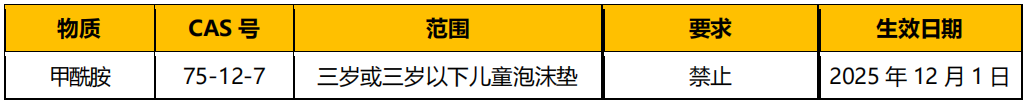 2023 年1 月26 日,美國(guó)紐約州發(fā)布草案 S02983《無(wú)甲酰胺兒童產(chǎn)品法》,提議禁止在三歲及三歲以下兒童泡沫墊產(chǎn)品中使用甲酰胺。如法案通過(guò),該要求將于2025 年 12 月1 日正式實(shí)施。