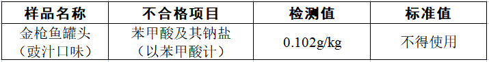 《食品安全國(guó)家標(biāo)準(zhǔn) 食品添加劑使用標(biāo)準(zhǔn)》(GB 2760—2014)中規(guī)定,苯甲酸及其鈉鹽(以苯甲酸計(jì))在水產(chǎn)動(dòng)物類(lèi)罐頭中不得使用;《食品安全國(guó)家標(biāo)準(zhǔn) 食品添加劑使用標(biāo)準(zhǔn)》(GB 2760—2014)中規(guī)定,苯甲酸及其鈉鹽(以苯甲酸計(jì))在醬鹵肉制品中不得使用。