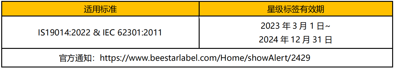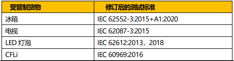自2024 年1 月1 日起,冰箱,電視機(jī),LED 燈泡,CFLi 的現(xiàn)行測(cè)試標(biāo)準(zhǔn)將被下列適用新標(biāo)準(zhǔn)所取代,如下表所示。生效日之后,所涉及的受管制貨物的新注冊(cè)和續(xù)期注冊(cè),應(yīng)按照修訂后的測(cè)試標(biāo)準(zhǔn)進(jìn)行測(cè)試: