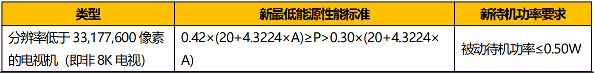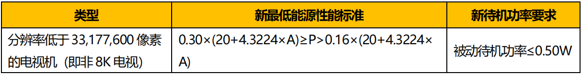 自2024年4月1日起,所有在新加坡銷售的分辨率低于33,177,600像素的電視機(jī)(即非8K電視)須滿足新的MEPS(新的最低能源性能標(biāo)準(zhǔn))要求如下表: