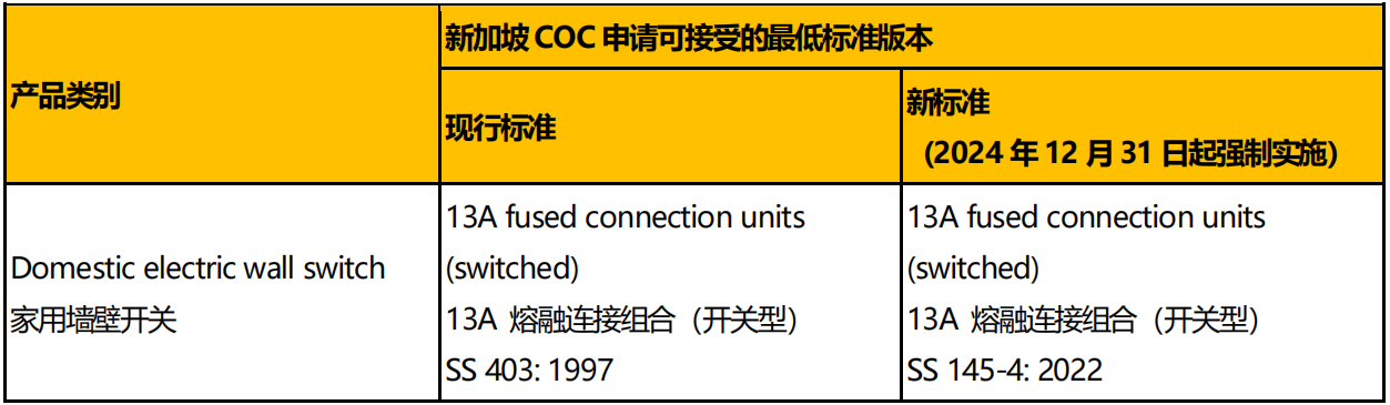 2023 年3 月31 日,新加坡消費(fèi)品安全辦公室(CPSO)發(fā)布通告CPSO-310323-08, 對(duì)《消費(fèi)者保護(hù)(安全要求)條例》(CPSR)列出的13A 熔融連接組合(開關(guān)型)的安全標(biāo)準(zhǔn)進(jìn)行了最新修訂,自2024 年12 月31 日起,新加坡安規(guī)申請(qǐng)接受的最低安全標(biāo)準(zhǔn)版本為SS 145-4: 2022。