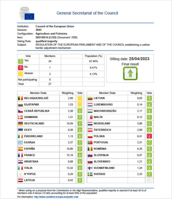 歐盟成員國(guó)以 24 票贊成、1 票反對(duì)、2 票棄權(quán)的結(jié)果通過(guò)了 CBAM。另外被通過(guò)的立法還包括歐盟碳市場(chǎng)(ETS)指令的修訂、設(shè)立社會(huì)氣候基金的法規(guī)、海運(yùn)船舶排放的 MRV 規(guī)則的修訂,以及航空業(yè)相關(guān)的碳市場(chǎng)規(guī)則的修訂。