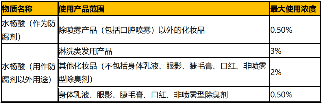 2023 年 6 月 9 日,歐盟消費(fèi)者安全科學(xué)委員會(huì)(SCCS)發(fā)布 SCCS/1646/23 號(hào)文件,即化妝品中水楊酸使用要求的最終意見,具體內(nèi)容見下表。該意見已通過 SCCS 審查,將于歐盟官方公報(bào)正式發(fā)布后生效。
