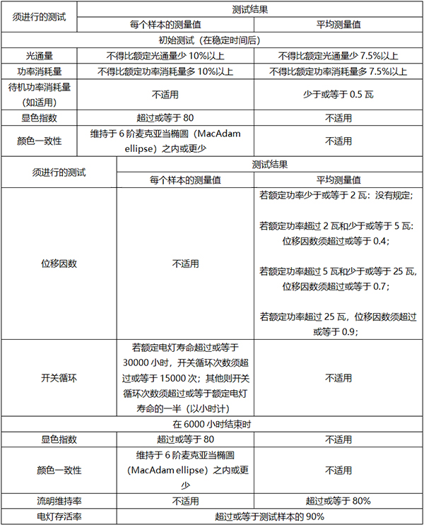 15.6.1、在依據(jù)條例第6 條向署長呈交的測試報告中,根據(jù)CIE 84、IEC 62612、IEC 62301 或署長批準的其他同等國際標準進行測試的結(jié)果必須顯示有關(guān)型號的發(fā)光二極管燈符合以下表現(xiàn)規(guī)定——