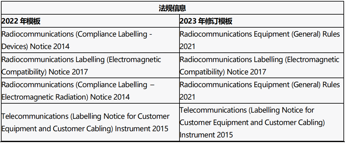 2023 年7 月消息,澳大利亞通信和媒體管理局(ACMA)修訂了供應商合規(guī)聲明(SDoC)模板,此次更新有一些措辭更新,但重點變更集中在法規(guī)信息方面,請參考重點如下表。