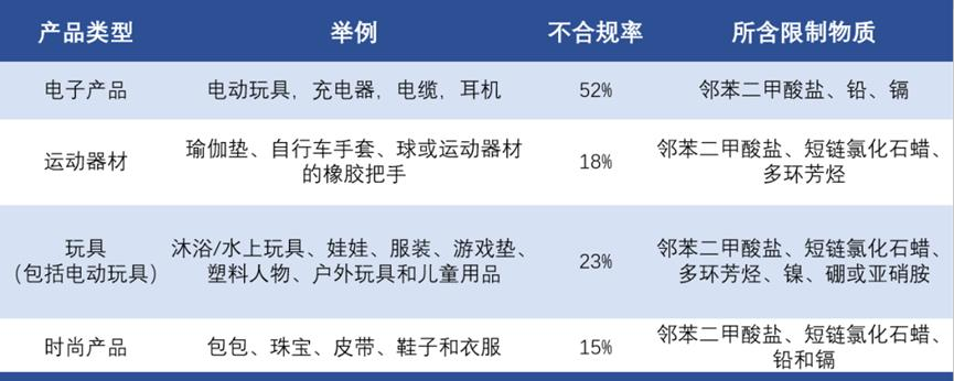 2023 年 12 月,歐洲化學(xué)品管理局(ECHA)論壇公布了第 10 次聯(lián)合執(zhí)法項(xiàng)目(REF-10)的調(diào)查結(jié)果。結(jié)果顯示,市場(chǎng)上某些消費(fèi)品中含有過(guò)量的危險(xiǎn)化學(xué)品,如鉛和鄰苯二甲酸鹽,總不合規(guī)率達(dá)到了 18%。