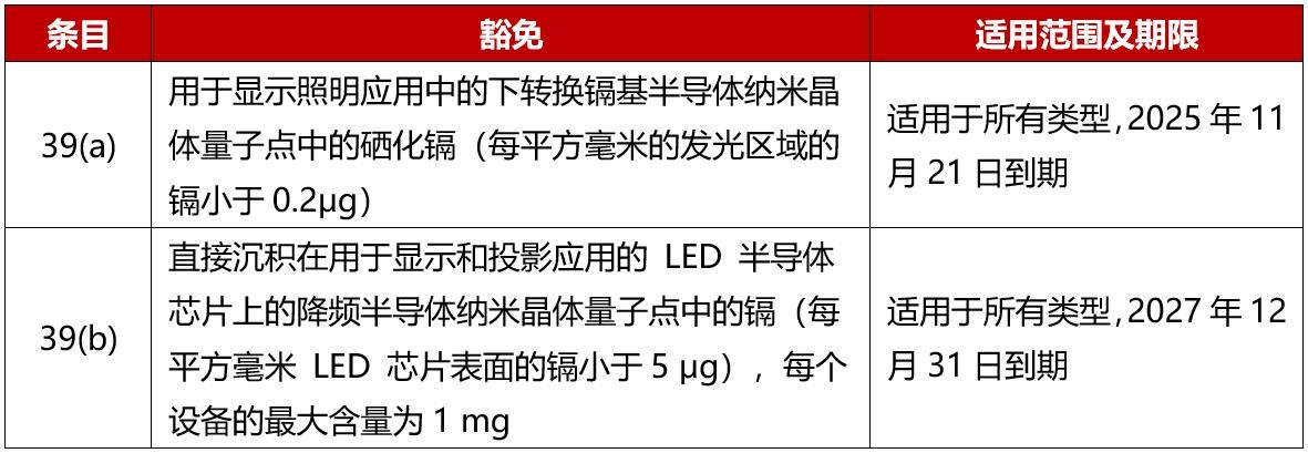 2024 年 5 月 21 日,歐盟在官方公報上發(fā)布(EU) 2024/1416 指令,更新歐盟 RoHS 指令(2011/65/EU)附件 III 中關于鎘的豁免條款,延長第 39(a)條款的豁免期限,新增第 39(b)條款的豁免。該指令將于發(fā)布后 20天生效,各成員國應于 2024 年 12 月 31 日前將其轉(zhuǎn)化為本國法規(guī),該豁免將于 2025 年 1 月 1 日起正式實施。