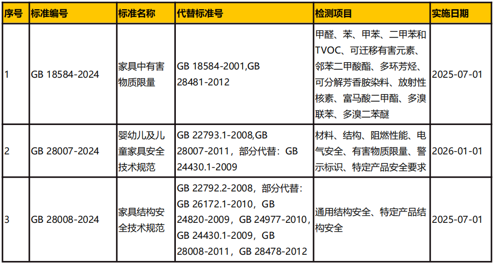 為充分發(fā)揮標(biāo)準(zhǔn)在家具產(chǎn)業(yè)中的規(guī)范引領(lǐng)作用,推動(dòng)提升家具產(chǎn)品質(zhì)量安全水平,國(guó)家市場(chǎng)監(jiān)督管理總局,國(guó)家標(biāo)準(zhǔn)化管理委員會(huì)于2024年7月發(fā)布GB 18584-2024《家具中有害物質(zhì)限量》、GB 28007-2024《嬰幼兒及兒童家具安全技術(shù)規(guī)范》、GB 28008-2024《家具結(jié)構(gòu)安全技術(shù)規(guī)范》3項(xiàng)家具強(qiáng)制性國(guó)家標(biāo)準(zhǔn)。該3項(xiàng)標(biāo)準(zhǔn)由工業(yè)和信息化部歸口。三份強(qiáng)制性國(guó)家標(biāo)準(zhǔn)分別從限制家具有害物質(zhì)、家具結(jié)構(gòu)安全以及保障特殊人群安全三個(gè)方面制定了相關(guān)的技術(shù)指標(biāo)。