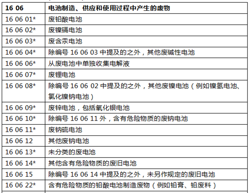 (3)關(guān)于 16 06 電池和蓄電池,將“電池和蓄電池”改為“電池制造、供應(yīng)和使用過程中產(chǎn)生的廢物”,同時(shí)將原來的 6 種物質(zhì)擴(kuò)展到 35 種,且多為危險(xiǎn)廢物。其中廢鋰電池、廢鋅電池、廢鈉電池均被列為危險(xiǎn)廢物。替換內(nèi)容如下(部分示例):