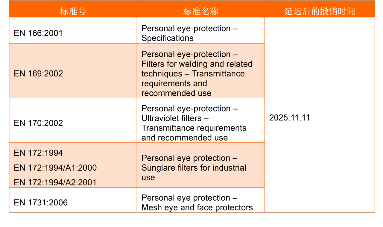 按實(shí)施決定(EU)2023/941,舊版本的協(xié)調(diào)標(biāo)準(zhǔn)原計(jì)劃在 2024 年 11 月被撤銷。由于新標(biāo)準(zhǔn)提出了較多新的技術(shù)要求,為給制造商足夠的時(shí)間調(diào)整,實(shí)施決定(EU)2024/2599 對部分協(xié)調(diào)標(biāo)準(zhǔn)的撤銷日期進(jìn)行延遲,其中包括 EN 166、EN 169、EN 170、EN 172 和 EN 379 等關(guān)于眼部和面部防護(hù)的標(biāo)準(zhǔn)。意味著制造商將有1年額外的時(shí)間來適應(yīng)新的標(biāo)準(zhǔn),并可以在 2025 年 11 月前依然按照舊版標(biāo)準(zhǔn)的相關(guān)要求進(jìn)行產(chǎn)品型式測試并申請 CE 認(rèn)證。