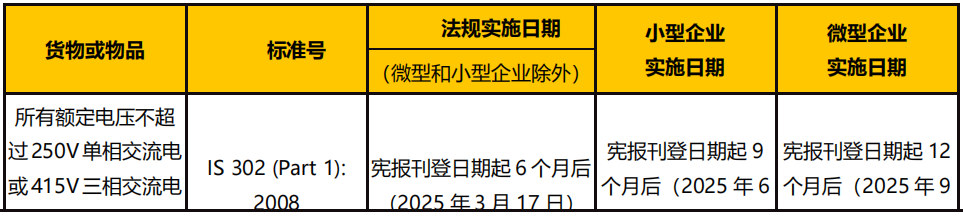 2024 年 9 月 17 日,印度標(biāo)準(zhǔn)局發(fā)布《家用及商用類似電器(質(zhì)量控制)令》,該法令適用于額定電壓不超過 250V 單相交流電或 415V 三相交流電的家用、商用或類似用途的電器;該法令自官方公報(bào)公布之日起生效。