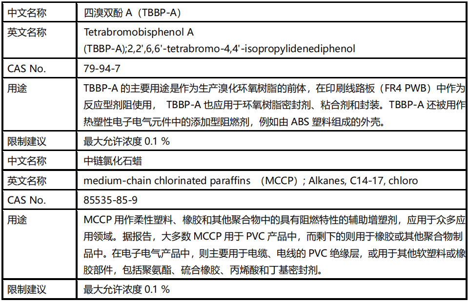 ? 2021 年,歐盟 RoHS 評(píng)估機(jī)構(gòu)發(fā)布 Pack15 的最終評(píng)估報(bào)告,建議將 TBBP-A 和 MCCPs 納入RoHS 限制。
