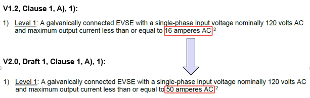 1、AC充電樁Level 1定義的最大輸出電流從16A提高到50A。