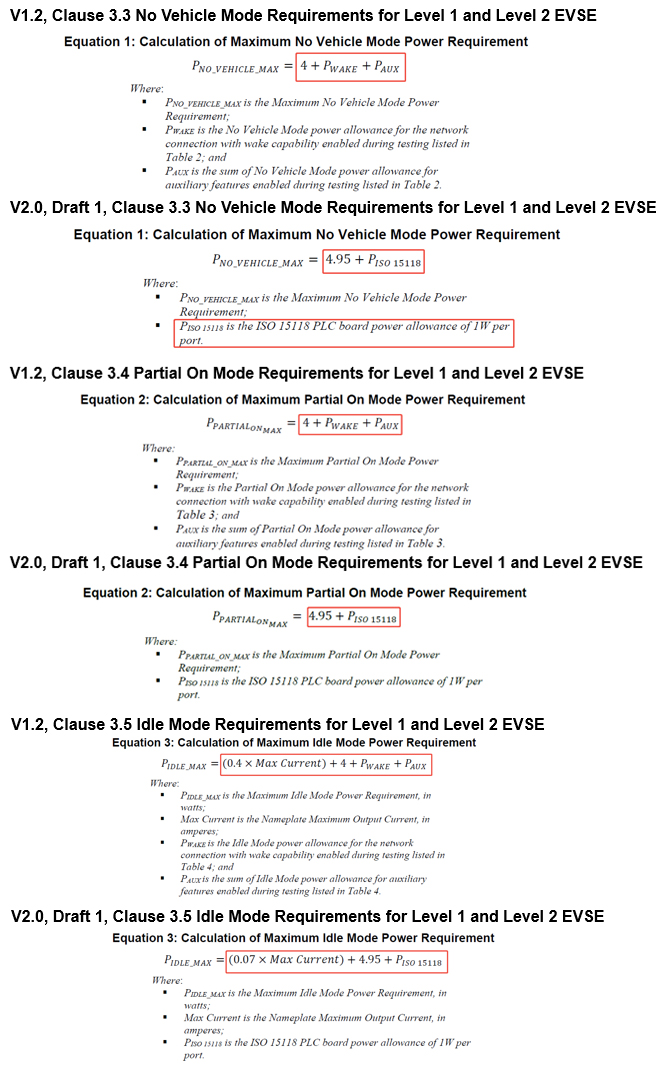 4、修改了AC充電樁在No Vehicle,Partial On,Idle模式下功率要求的計(jì)算公式,去掉了網(wǎng)絡(luò)喚醒(PWAKE)和輔助功能(PAUX)的加權(quán)值,增加了ISO 15118(PISO 15118)的加權(quán)值。