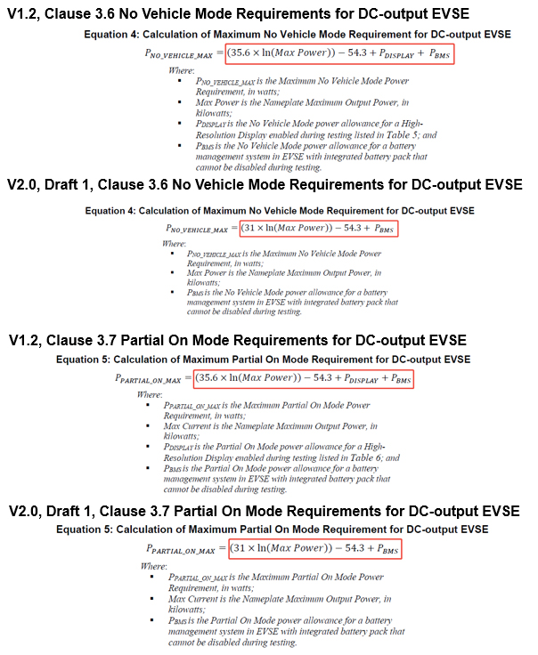 5、修改了DC充電樁在No Vehicle,Partial On模式下功率要求的計(jì)算公式,Max Power自然對(duì)數(shù)的倍數(shù)從35.6降為31,并去掉了顯示器的加權(quán)值(PDISPLAY)。