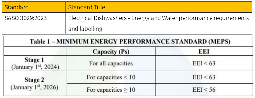 2025年9月,沙特阿拉伯標(biāo)準(zhǔn)組織SASO(Saudi Standards, Metrology and Quality Organization)發(fā)出通知提醒,電動(dòng)洗碗機(jī)產(chǎn)品的最新能效標(biāo)準(zhǔn)SASO 3029:2023將于2026年1月1日起實(shí)施第二階段要求。