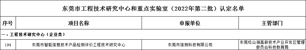 近日,東莞市科學(xué)技術(shù)局發(fā)布《市科技局關(guān)于認(rèn)定東莞市工程技術(shù)研究中心和重點(diǎn)實(shí)驗(yàn)室(2022年第二批)的通知》,東莞市信測科技有限公司申報(bào)的東莞市智能信息技術(shù)產(chǎn)品檢測評(píng)價(jià)工程技術(shù)研究中心被正式認(rèn)定為東莞市工程技術(shù)研究中心。
