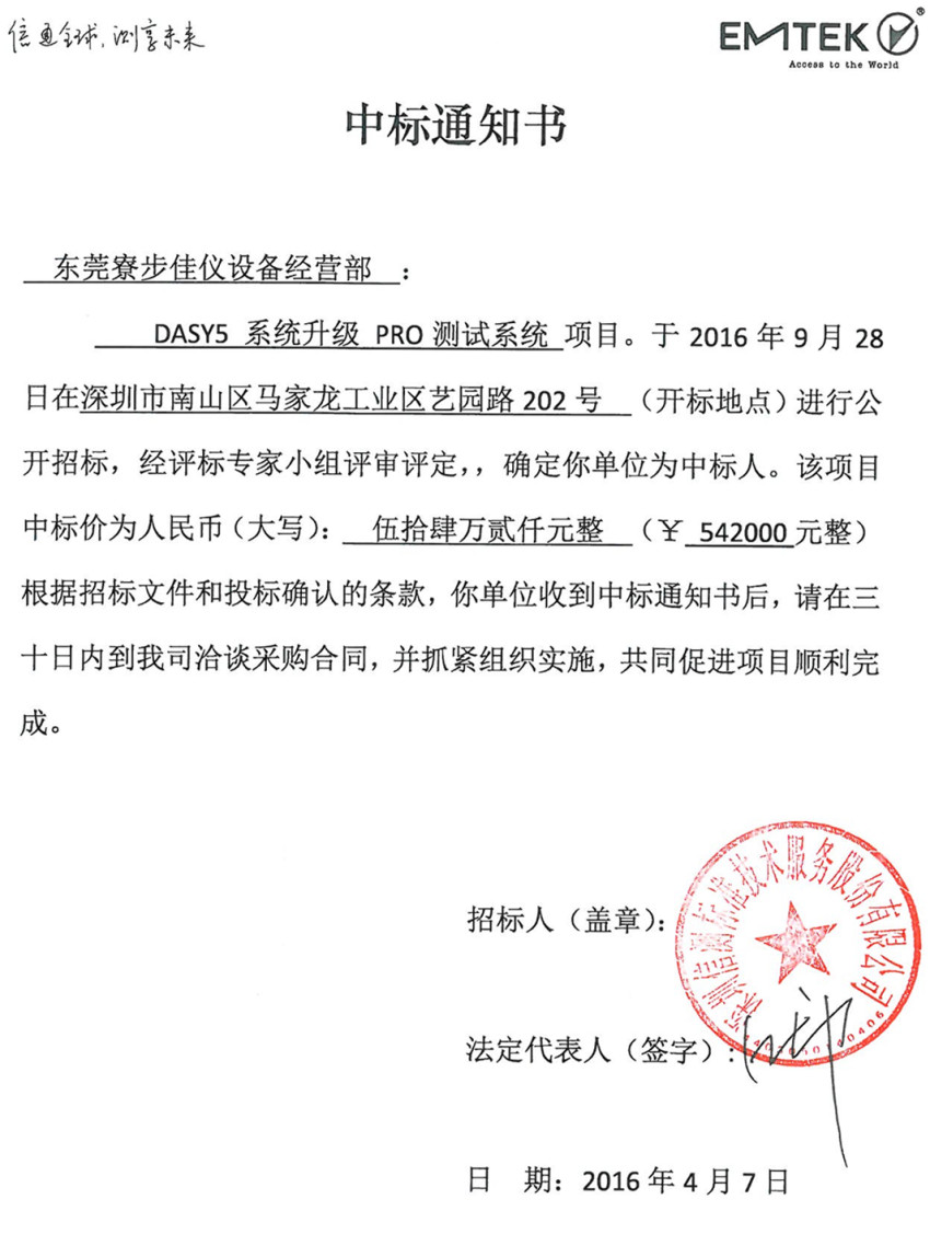 佳儀設(shè)備中標(biāo)通知書(shū)