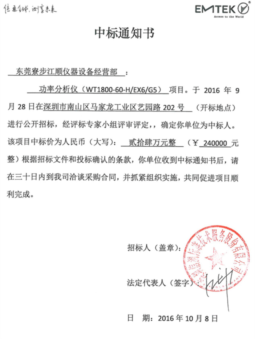 江順儀器設(shè)備中標(biāo)通知書